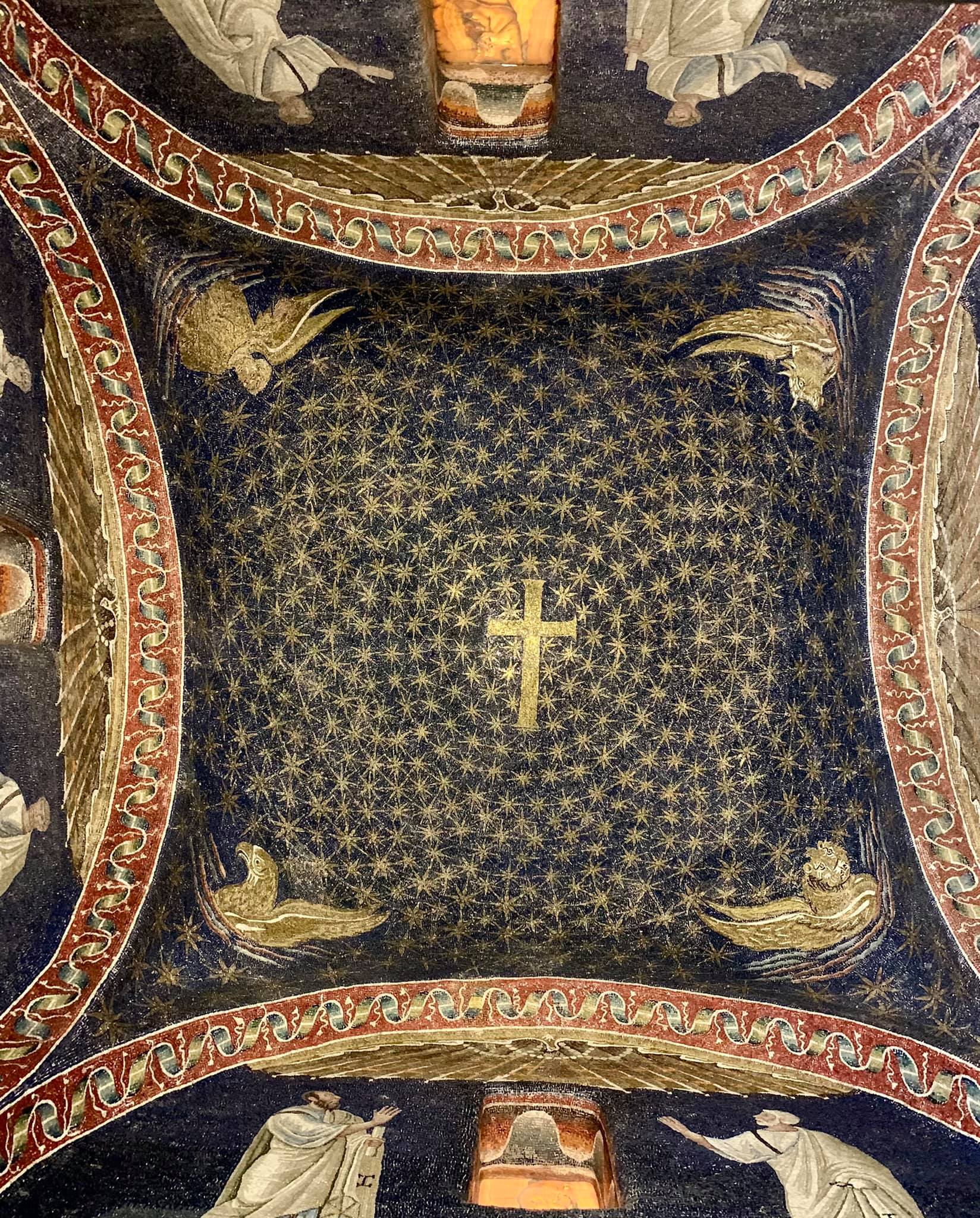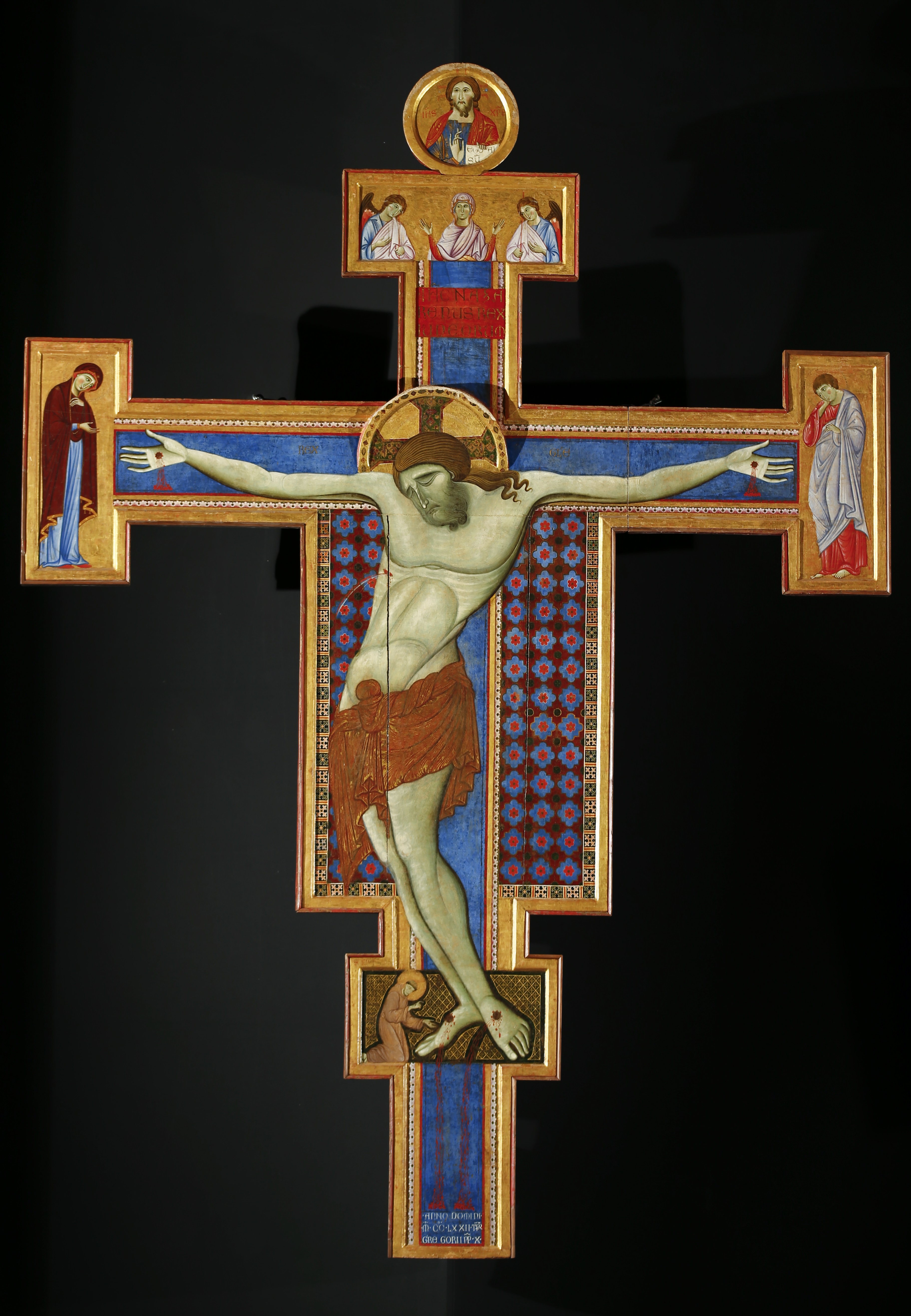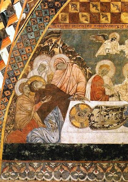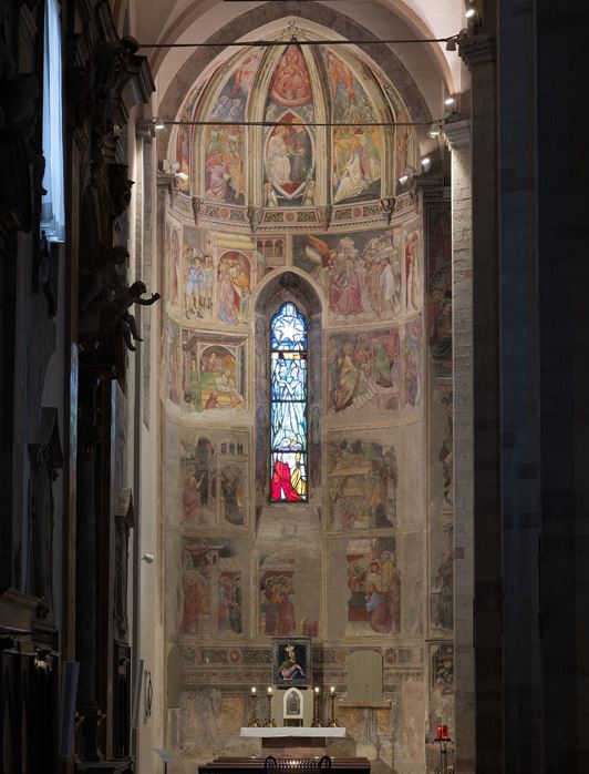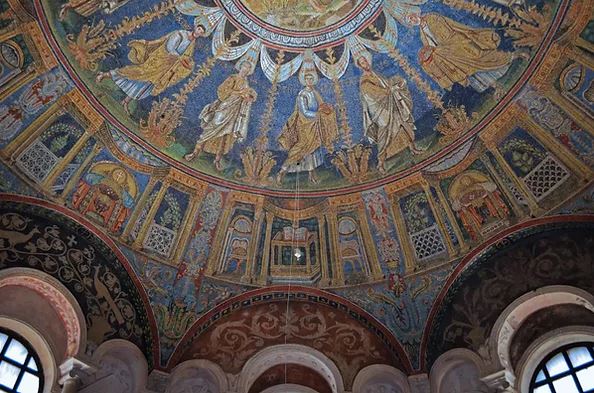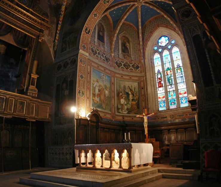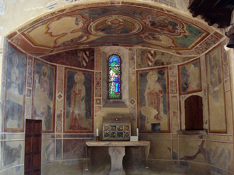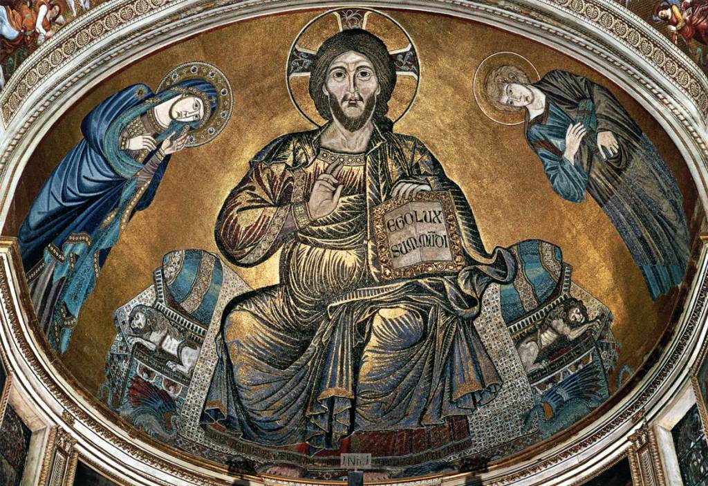 The apse mosaic depicts Christ in Majesty holding an open book in his left hand with the inscription EGO SUM LUX MUNDI (I am the light of the world). With his right hand he is giving benediction. He is flanked by the Virgin, who has raised her hands in intercession, and St John the Evangelist. The head of St. John was completed by Cimabue in 1302 and this was to be his last work as he died in Pisa in the same year.