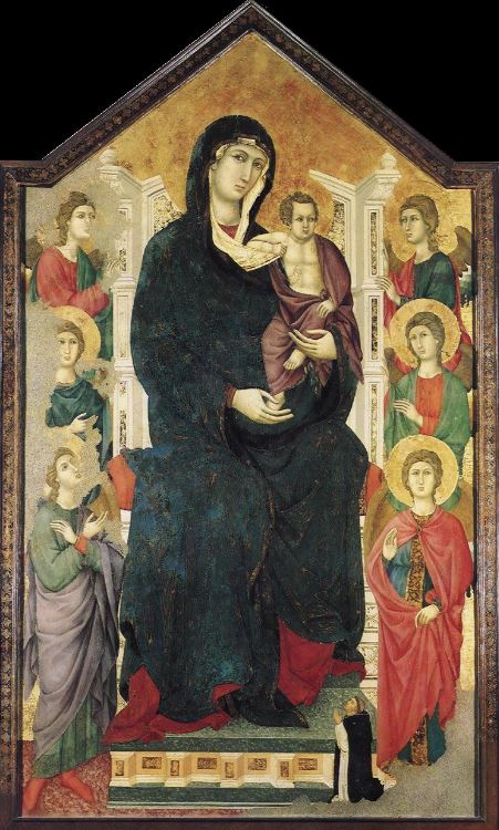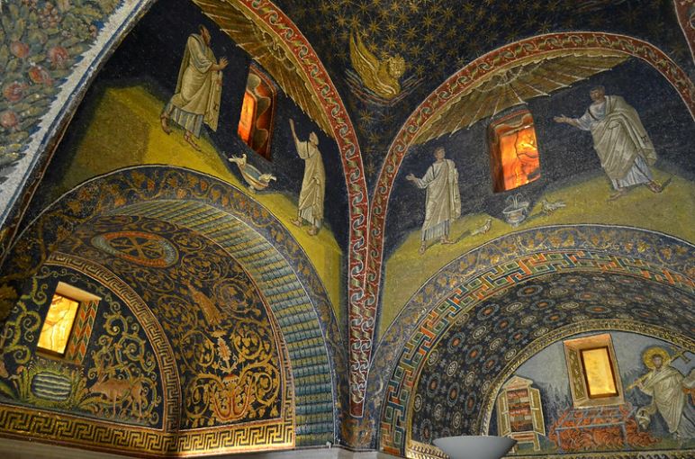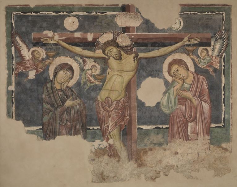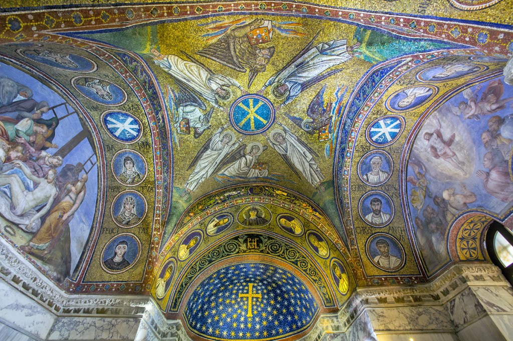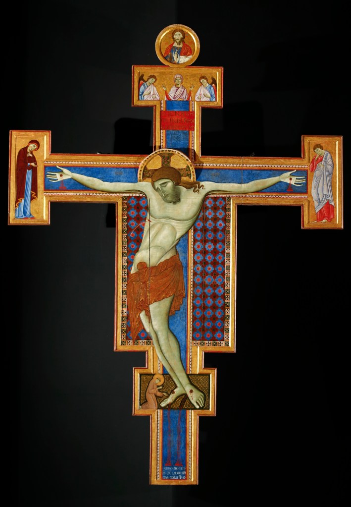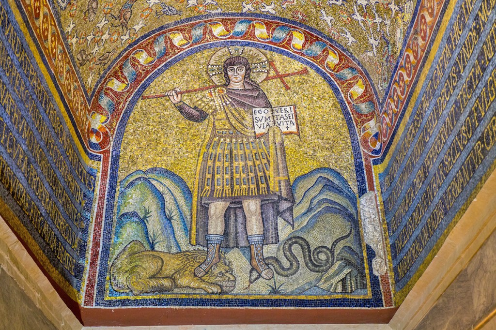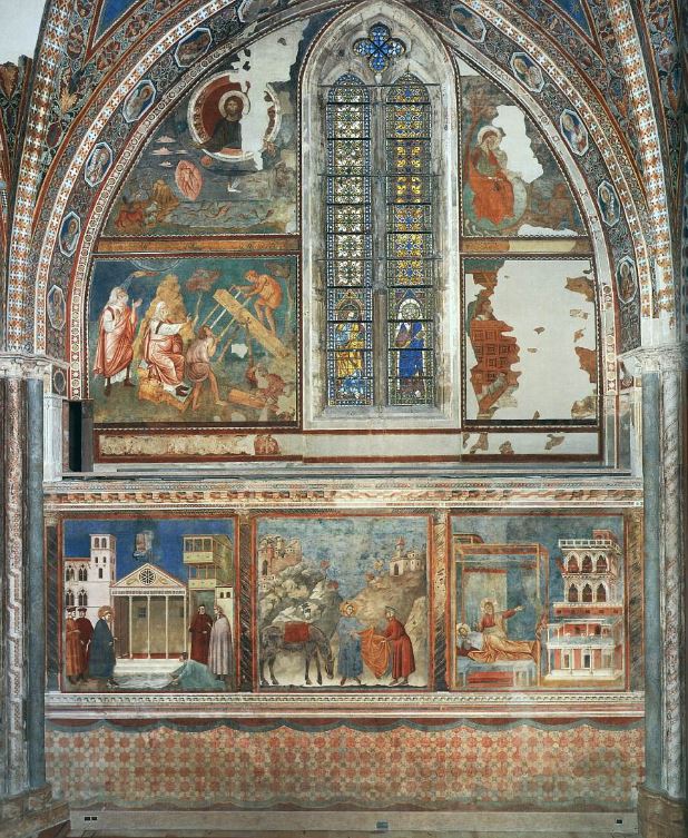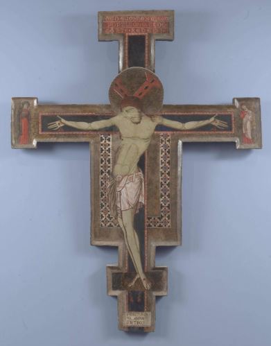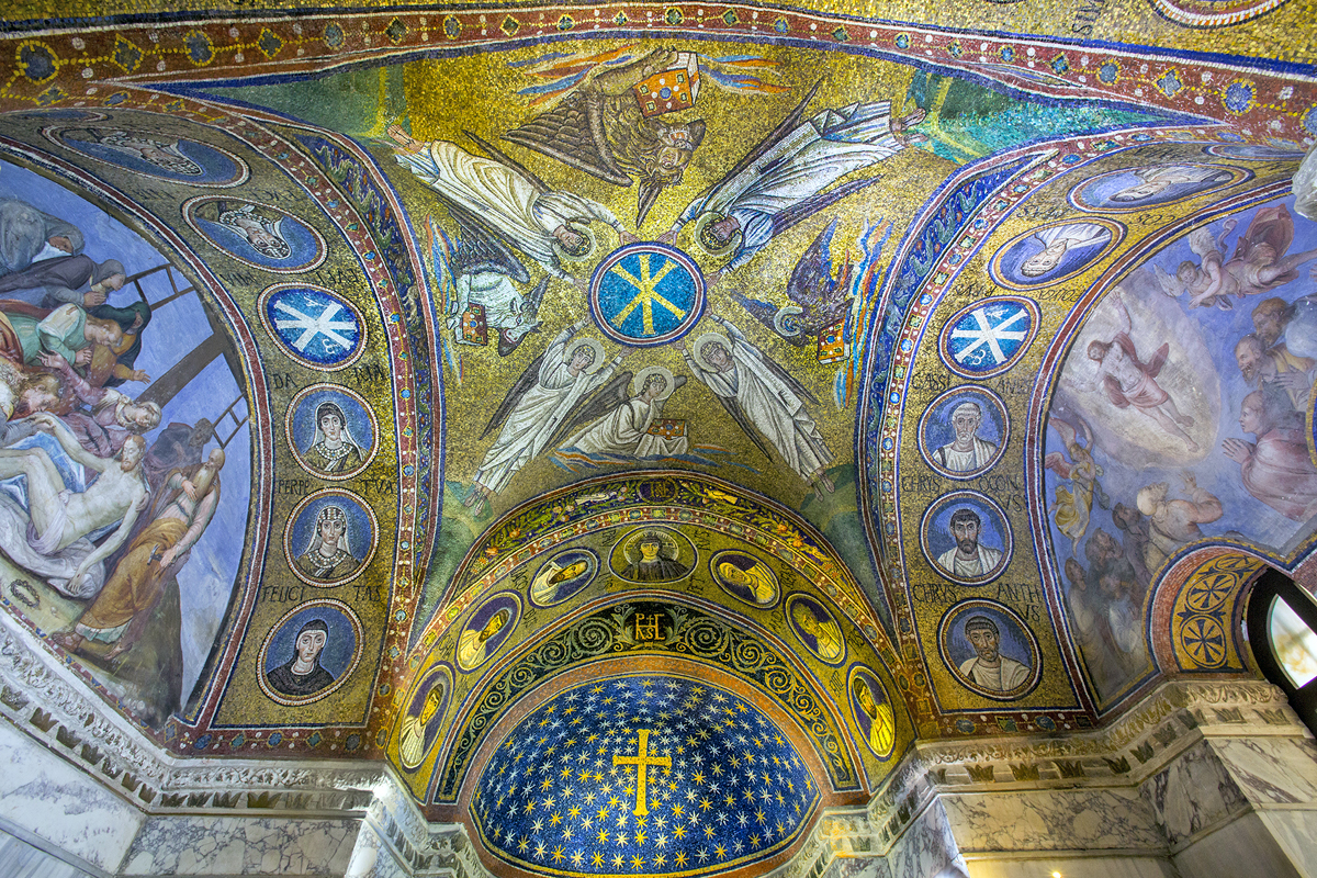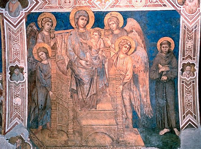 The apse mosaic depicts Christ in Majesty holding an open book in his left hand with the inscription EGO SUM LUX MUNDI (I am the light of the world). With his right hand he is giving benediction. He is flanked by the Virgin, who has raised her hands in intercession, and St John the Evangelist. The head of St. John was completed by Cimabue in 1302 and this was to be his last work as he died in Pisa in the same year.