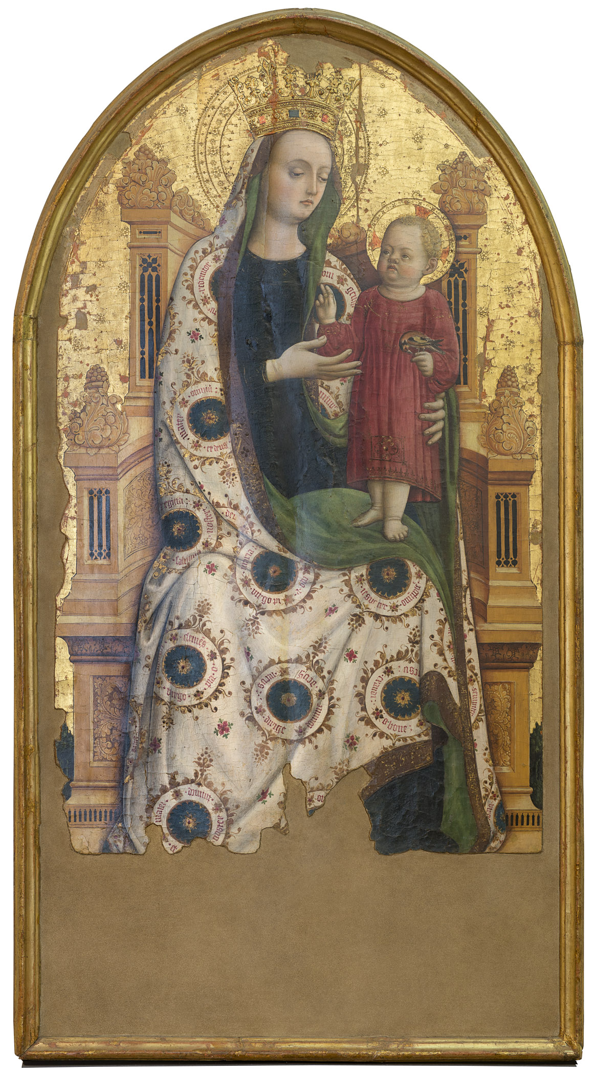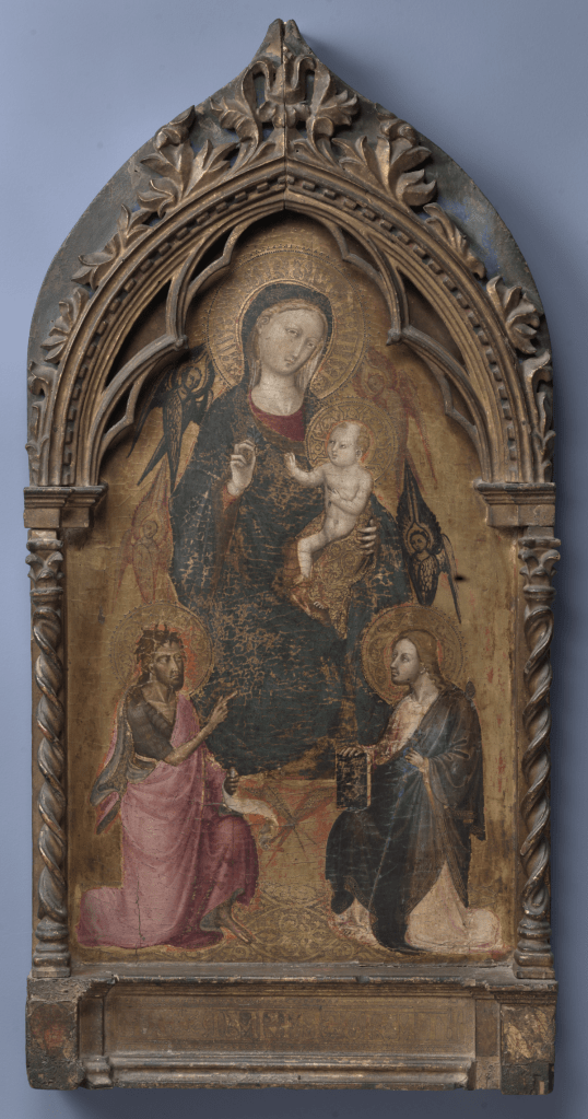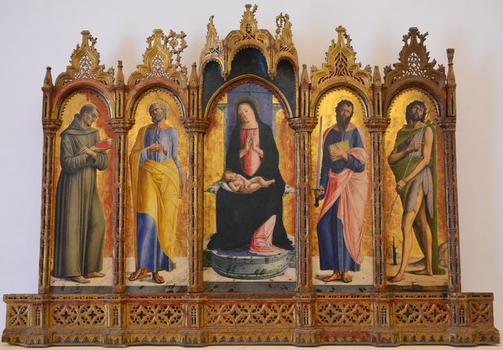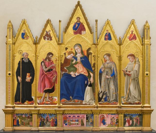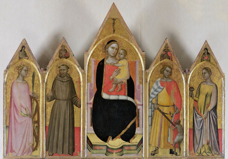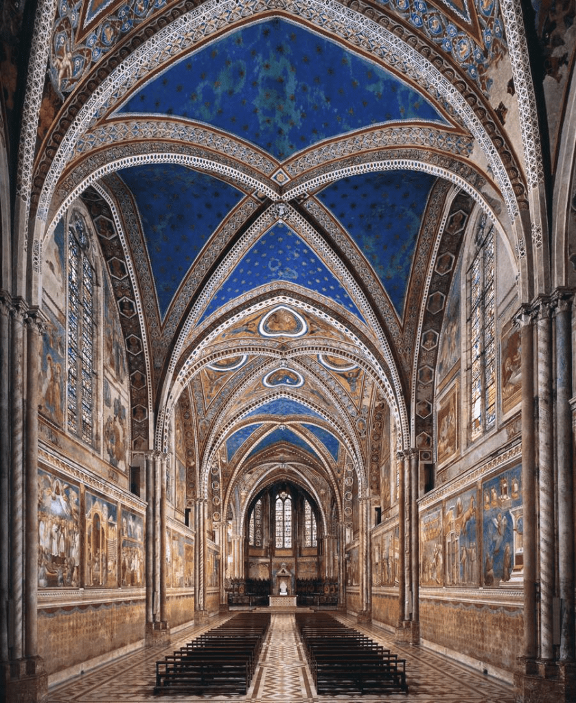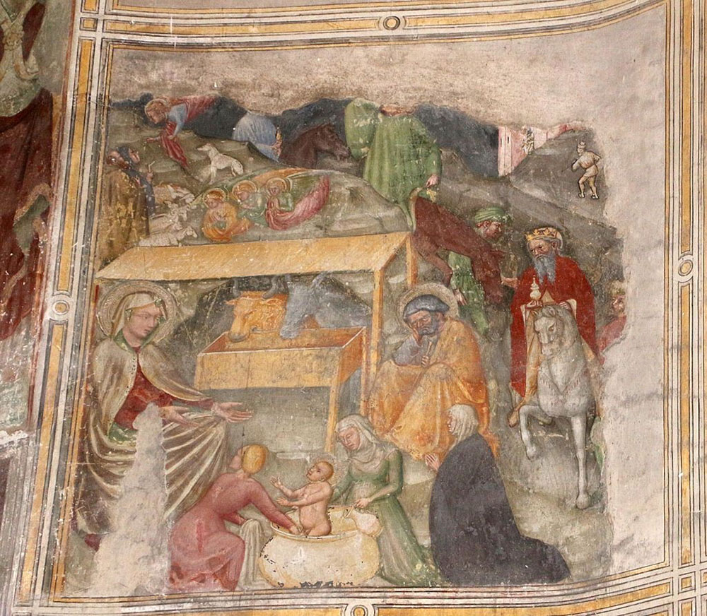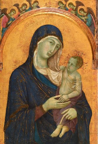 The apse mosaic depicts Christ in Majesty holding an open book in his left hand with the inscription EGO SUM LUX MUNDI (I am the light of the world). With his right hand he is giving benediction. He is flanked by the Virgin, who has raised her hands in intercession, and St John the Evangelist. The head of St. John was completed by Cimabue in 1302 and this was to be his last work as he died in Pisa in the same year.