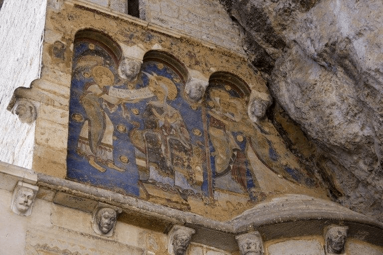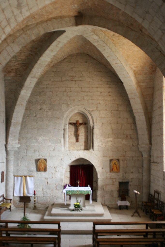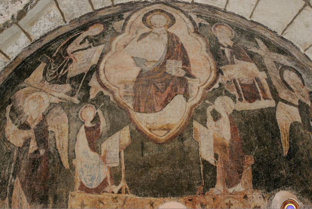 Inside, a thirteenth-century fresco decorates the semi-dome apse. It depicts Christ in glory, with the Evangelists on either side writing the Gospels. At the bottom left, Saint Michael is weighing the souls, whilst on the right, seraphim welcome the righteous into heaven.