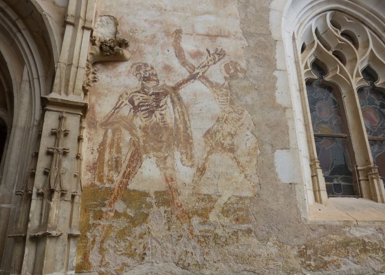 Alongside the entrance to the chapel are the remains of what would have been a bigger, thirteenth-century fresco of the dance macabre.