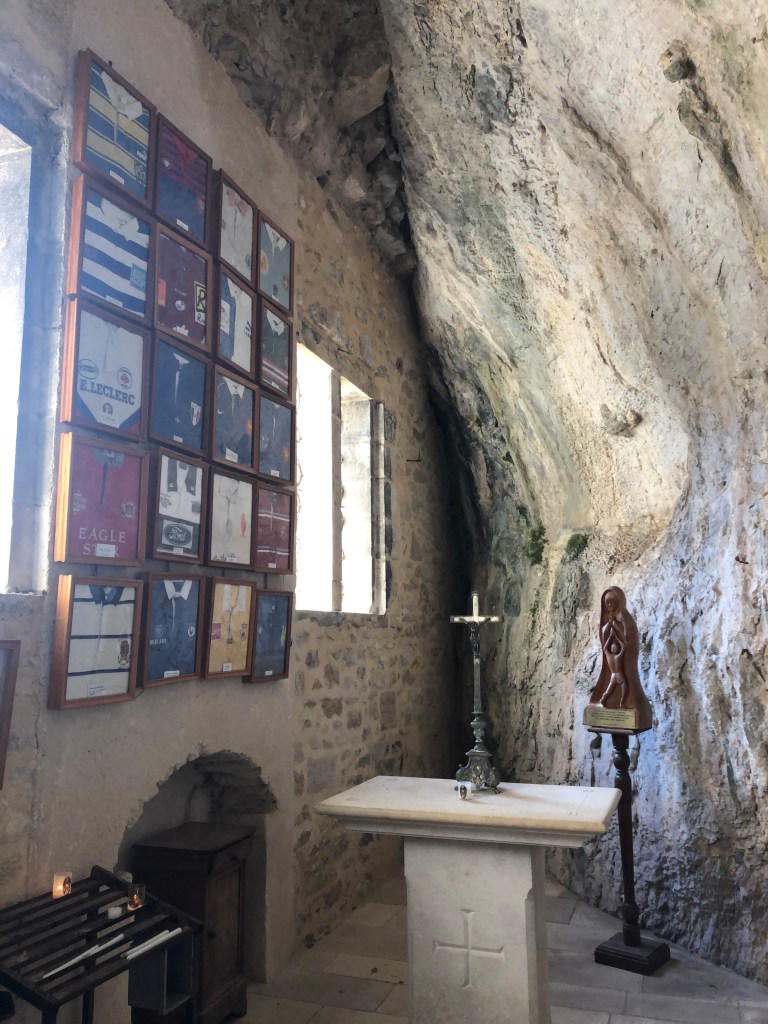 The chapel, which is built into the cliff, was originally dedicated to King Louis, who travelled to Rocamadour as a pilgrim in May 1244, accompanied by his mother, Queen Blanche, and his brothers. In 1297, Louis became the first layman to be canonized. However, interestingly, the chapel has more recently been rededicated to rugby players and prayers are now said there for those injured during a game. Consequently, the chapel has on display the shirts of many famous rugby players from all over the world.