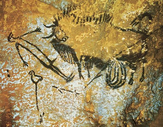 Man (with bird head?), bird and (disembowelled?) bison, The Shaft, Lascaux
