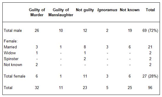 Table 1 shows the outcome of the Norfolk trials. As it indicates, murder in seventeenth-century Norfolk was predominantly a male crime, seventy-two per cent of all those charged were men. However, this is lower than both Surrey, where Beattie found that ninety-one per cent of those charged between 1660 and 1800 were male, and Essex, where Sharpe found eighty-four per cent male.[64] The dominance of men is likely to reflect the fact that they were more likely to respond physically in disputes than women, who more often used words, and that they were also more likely to be carrying weapons or tools that could kill. Not only does the Norfolk evidence show that far fewer women than men were charged with murder, but also that when they were, they were less likely to be found guilty. Twenty per cent of men indicted were either found not guilty by trial juries or their draft indictments were marked ignoramus by grand juries. For women this increased to nearly fifty-two per cent.